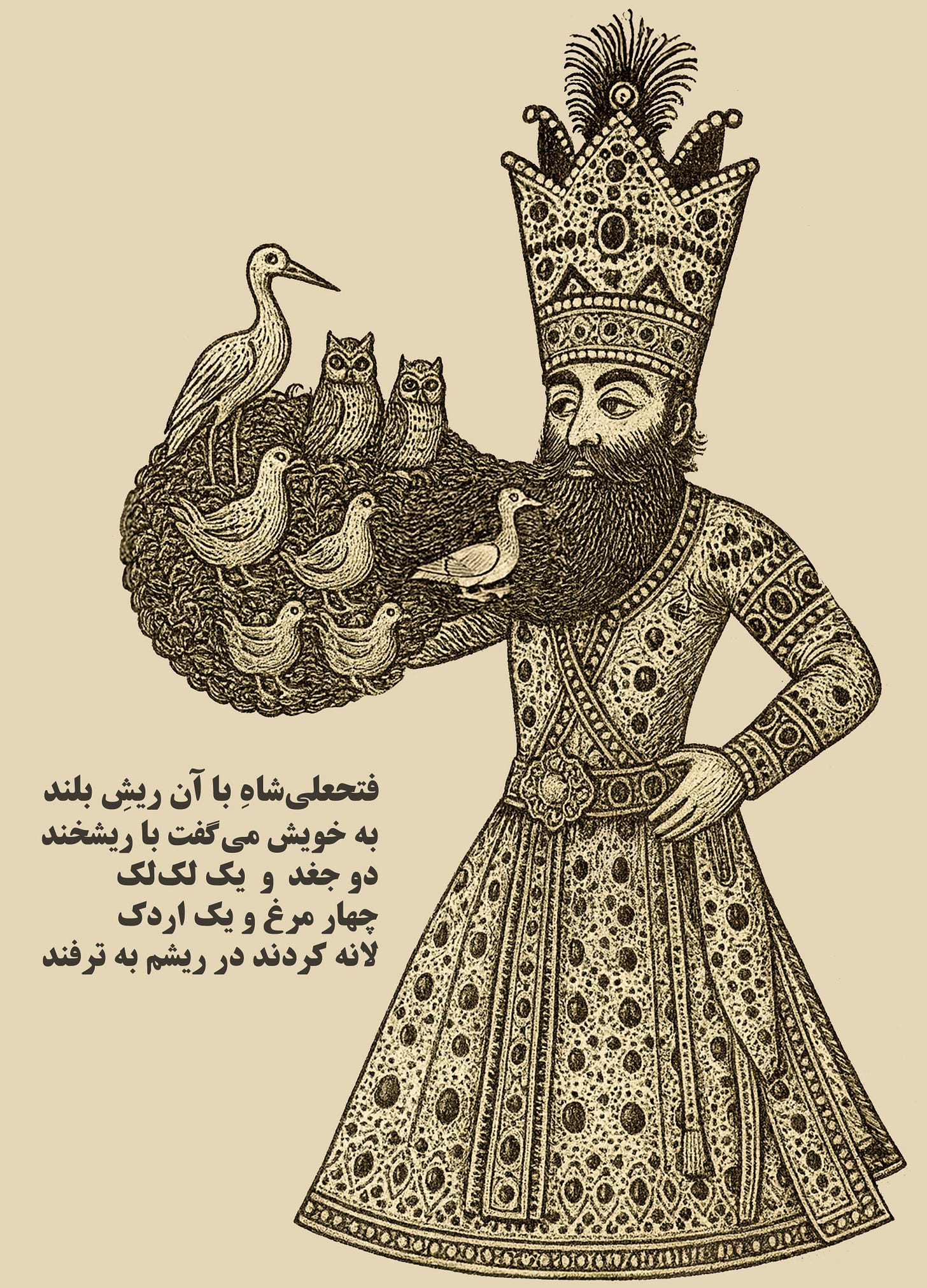 In the end, I chose Fath-Ali Shah because his famously extravagant beard invites exactly this kind of playful exaggeration. He has long existed somewhere between history and caricature, a figure whose self-fashioned grandeur almost asks to be reimagined. Transforming his beard into a nesting ground for birds allowed humour, satire and a touch of myth to meet in one image. It felt like a fitting way to close this reflection: a reminder that the boundaries between the real and the absurd are often far thinner than we think, and that sometimes a story reveals itself most clearly when approached with a smile.