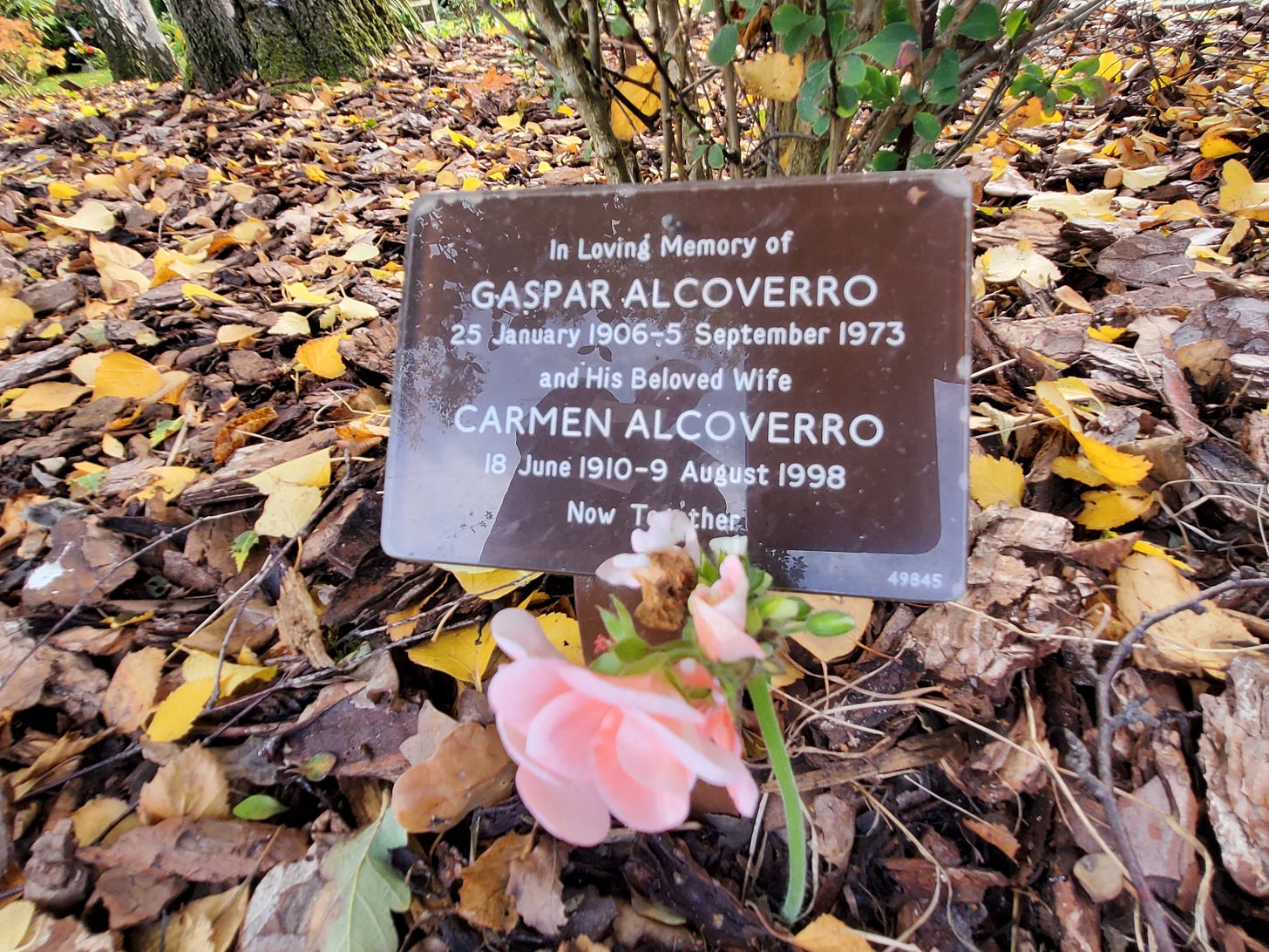 It was autumn. Fallen leaves covered the ground. The memorial plaques were set low, almost discreet, and not easy to find. Eventually we saw it beneath a small shrub, partly framed by leaves. A dark plaque close to the earth. His name. His dates. And beneath them, the words “Now Together” beside the name of his wife, Carmen. A small flower, fallen from a nearby tree, rested on the ground beside it.